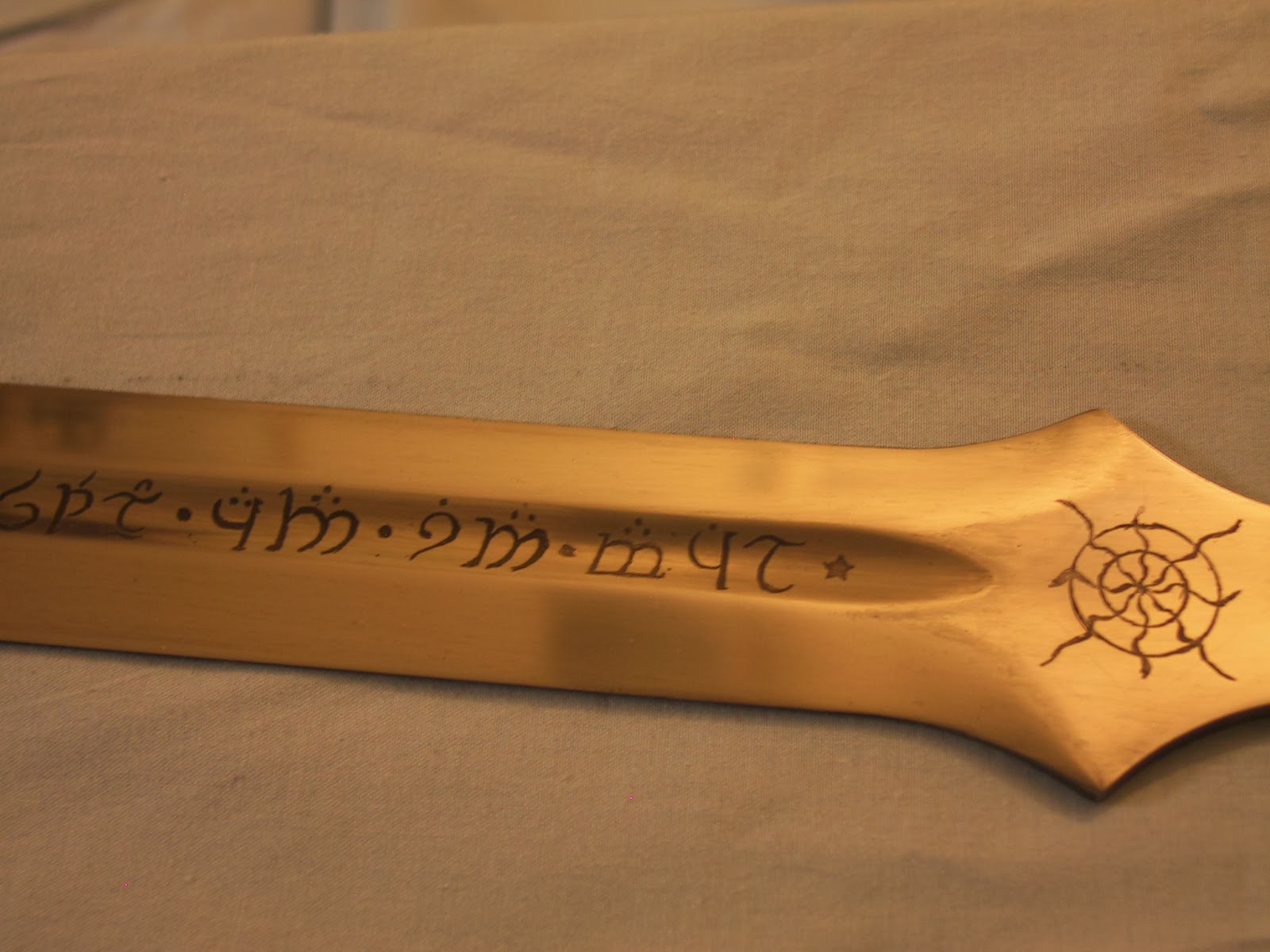 At this point all those many years ago I had not really settled on a hilt design, but it occurred to me that I could at least decorate the blade with "runes or other decorations." And so I began a mini-journey to develop a "runic" inscription and other decoration that I felt would be consistent with J.R.R. Tolkien's Middle Earth. Actually, this proved to be a more extensive travail than I initially realized!